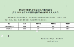 雅安市名山區(qū)茶城建設(shè)工程有限公司系雅安市名山區(qū)區(qū)屬一級(jí)國(guó)有企業(yè),成立于2018年10月,注冊(cè)資本金25000萬(wàn)元,主要經(jīng)營(yíng)范圍為對(duì)土地、城市資源等領(lǐng)域及保障性住房、房地產(chǎn)開發(fā)、城市基礎(chǔ)設(shè)施、公共服務(wù)設(shè)施等進(jìn)行經(jīng)營(yíng)管理;并開展項(xiàng)目投資、工程管理服務(wù)、園林綠化、環(huán)境治理工程、土地整理和各類工程建設(shè)活動(dòng)等。根據(jù)公司2023年人員招聘計(jì)劃,茶城公司擬面向社會(huì)公開招聘3名工作人員?,F(xiàn)將有關(guān)事項(xiàng)公告如下:一、報(bào)名條件(一)招錄崗位、名額及招錄資格條件(見(jiàn)附表)(二)基本條件1.本科及以上學(xué)歷、學(xué)士及以上學(xué)位。包括2023年應(yīng)屆高校畢業(yè)生;2022年、2021年未參加工...