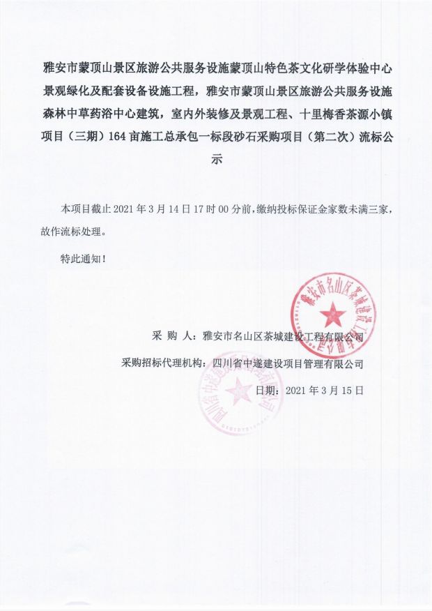 雅安市蒙頂山景區(qū)旅游公共服務(wù)設(shè)施蒙頂山特色茶文化研學(xué)體驗(yàn)中心景觀綠化及配套設(shè)備設(shè)施工程,雅安市蒙頂山景區(qū)旅游公共服務(wù)設(shè)施森林中草藥浴中心建筑,室內(nèi)外裝修及景觀工程、十里梅香茶源小鎮(zhèn)項(xiàng)目(三期)164畝施工總承包一標(biāo)段砂石采購項(xiàng)目(第二次)流標(biāo)公示