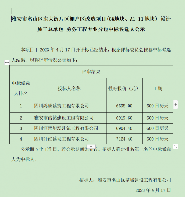 雅安市名山區(qū)東大街片區(qū)棚戶區(qū)改造項(xiàng)目(8#地塊、A1-11地塊) 設(shè)計(jì)施工總承包-勞務(wù)工程專(zhuān)業(yè)分包中標(biāo)候選人公示