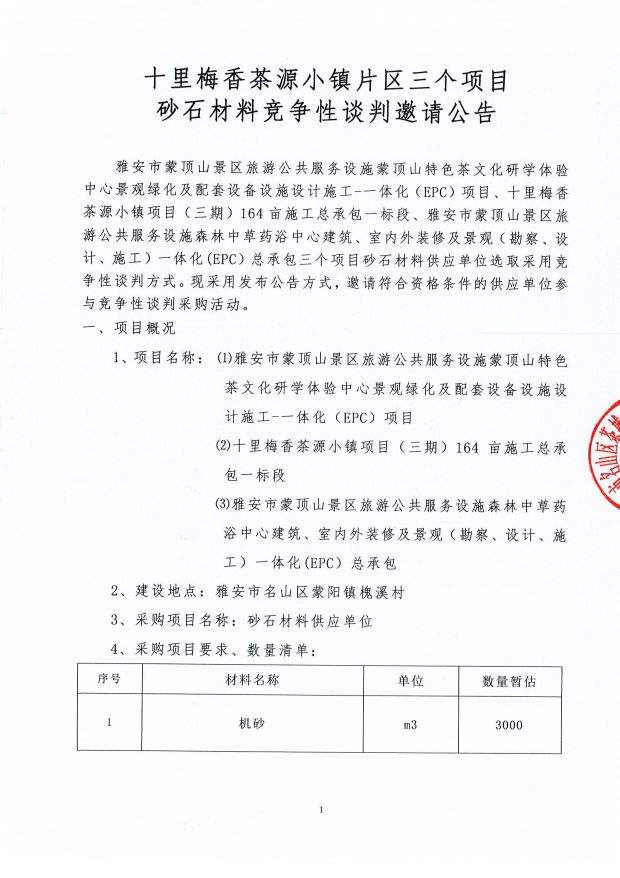 十里梅香茶源小鎮(zhèn)片區(qū)三個(gè)項(xiàng)目砂石材料競(jìng)爭(zhēng)性談判邀請(qǐng)公告